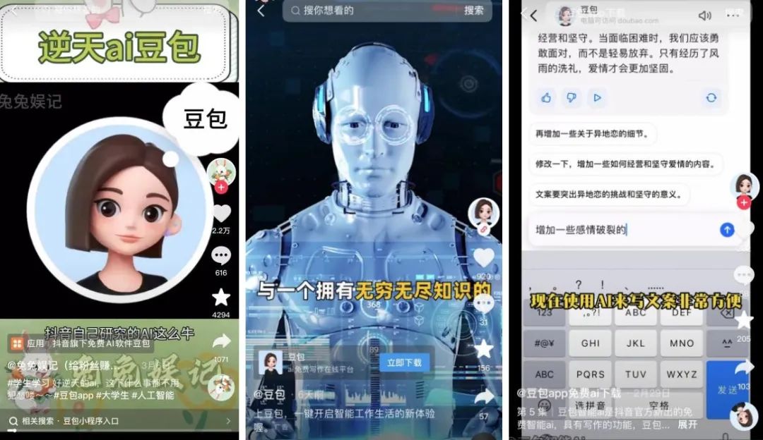 豆包的主战场是“关系更近”的抖音,其推广打法和消费品在抖音上的营销颇为相似——常规信息流广告,在短视频中推荐用户下载安装;巨量星图合作推广,借助KOL和KOC放大影响力;“豆包智能AI”和“豆包AI助手”还会在直播间持续讲解AI用法,引导用户下载。