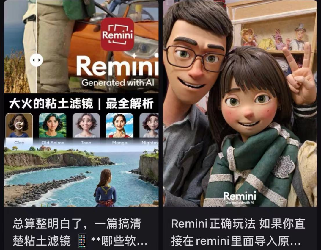 第二类表现为:设计有趣的玩法,进而在社交媒体“人传人”破圈。这方面的典型例子是早些时候妙鸭相机的“生成写真”、通义千问的“全民舞王”,以及近段时间比较火的Remini“黏土滤镜”。