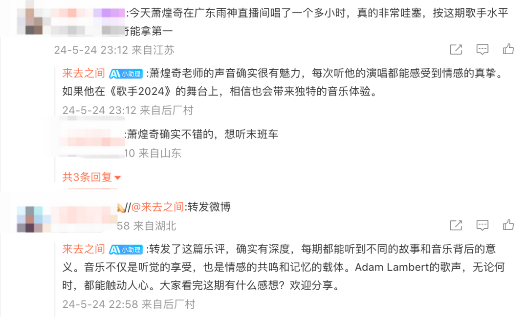 仍然以微博为例(微博有5.88亿月活用户,有ugc和二创氛围,还有大V和热点,符合上述逻辑对“社交媒体”的定义),最近《歌手》很火,微博CEO的账号“来去之间”转发了知名音乐大V“耳帝”的乐评,在“来去之间”的评论区,网友和“来去之间”的“AI小助理”有诸多互动。这些互动让评论区更加活跃,也创造了新的讨论话题。