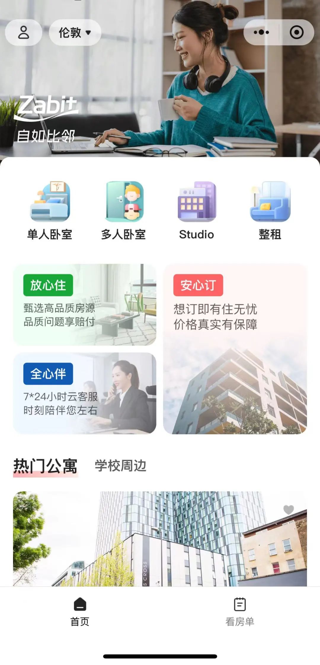 在自如APP上,点击“留学租房”的按钮即可跳转ZABIT平台的微信小程序链接。据小程序首页显示,目前自如比邻ZABIT除了中国香港和英国主要城市的房源之外,还上线了美国洛杉矶和加拿大蒙特利尔的房源,此外新加坡也显示“即将开启”。