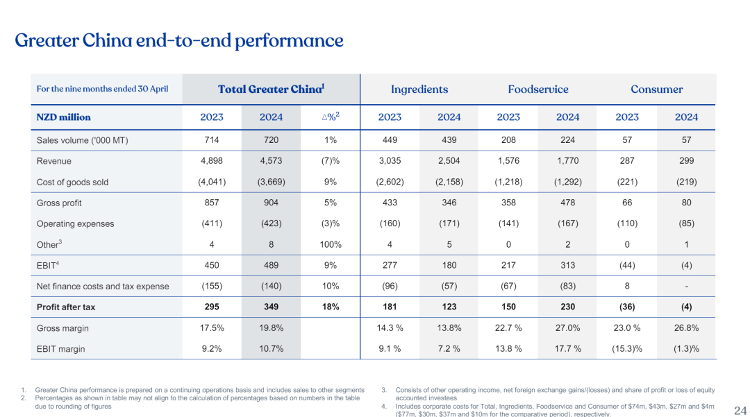 如今,中国市场占据了恒天然全球约三分之一的业务量。截至4月30日的2024财年前9个月,恒天然在华收入略有下滑,而利润和销量则实现了增长。