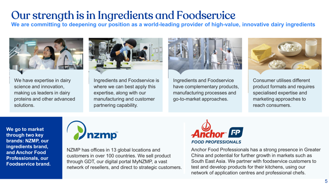 该公司在一份投资者资料中表示,在全球范围内,其强项在于原料业务和餐饮服务,分别有NZMP和安佳专业乳品专业伙伴这两大品牌。由于致力于巩固作为“全球领先的高价值创新乳制品原料供应商”的地位,其战略方向发生重大变化。