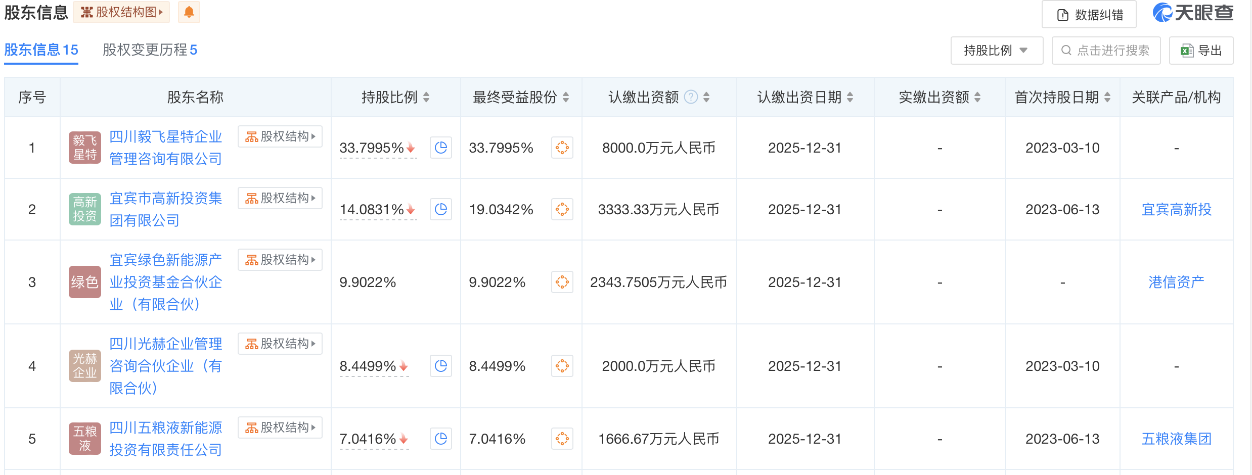 四川五粮液新能源投资有限责任公司目前是和光同程的第五大股东,持股比例约7%。