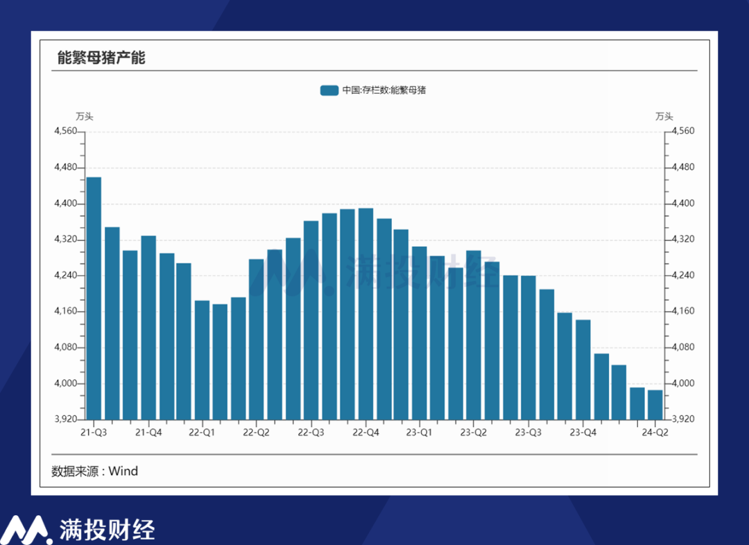 根据Wind数据,截至2024年4月末,我国能繁母猪的存栏量为3986万头,生猪行业产能已经开启了16个月之久,较2022年年末的去化幅度已经达到10%的水平,目前的能繁母猪存栏量是2021年以来的最小值。