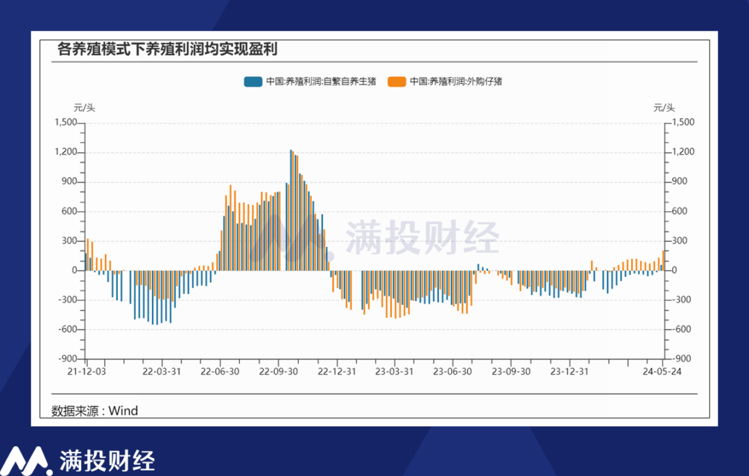 根据Wind数据,上周(5月20日—24日)自繁自养生猪利润为58.21元/头,外购仔猪养殖利润204.15元/头,各种模式下的养殖利润均有所提升,其中自繁自养生猪利润在经历了34周的连续亏损后,终于实现扭亏为盈,也标志着生猪养殖行业摆脱了长期的亏损阴影。