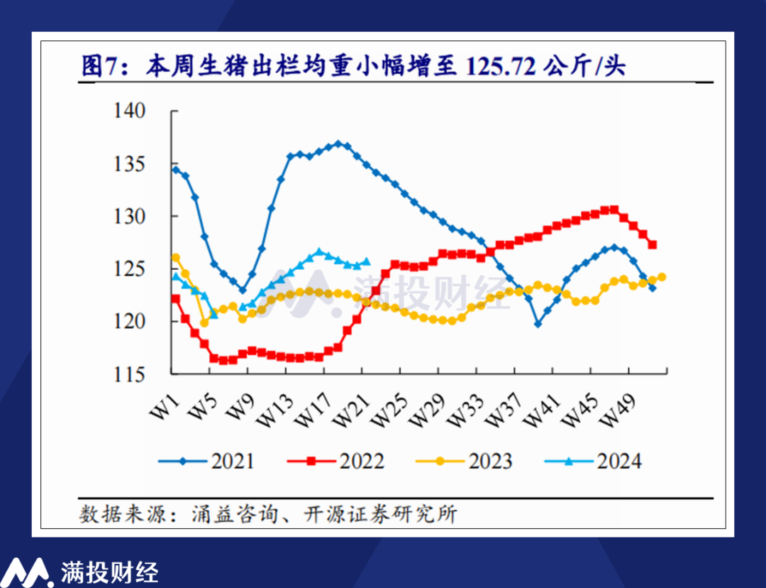 二次育肥导致的直接结果就是出栏生猪均重的变化,参考涌益数据,2024年2月至4月,生猪出栏均重连续8周上行,从120.7kg/头提升至125.4kg/头。而上周(5月20—24日)生猪出栏均重再次提升,为125.72 公斤/头(周环比+0.42 公斤/头),后续有望对猪价的继续上涨加强支撑。