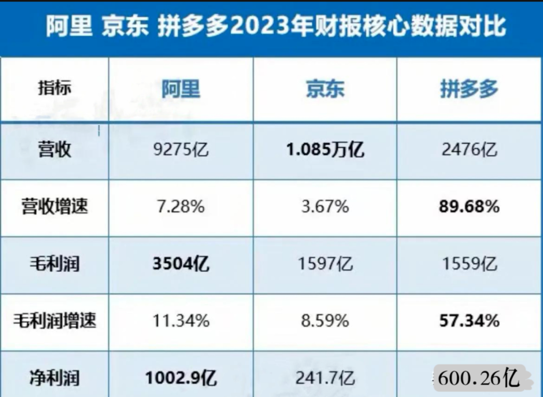 再看2023年财报核心数据,阿里营收9275亿元,营收增速7.28%,毛利3504亿元,毛利增速11.34%;京东营收1.09万亿元,营收增速3.67%,毛利1597亿元,毛利增速8.59%;拼多多营收2476亿元,营收增速89.68%,毛利1559亿元,毛利增速57.34%。