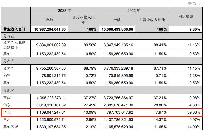 值得一提的是,华北地区成为了新乳业新的业绩增长点,在其他地区都在个位数增长的时候,华北地区的营收同比增长了39.03%,占比从2022年的7.97%升至2023年的10.03%。