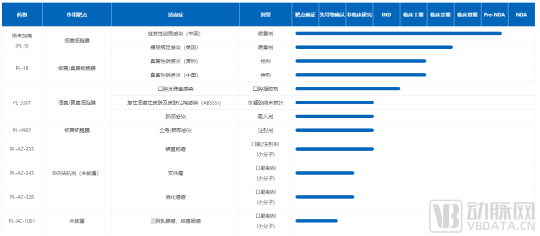 在产品管线上,普莱医药针对不同的适应症,目前推出了包含抗菌肽与抗肿瘤拟肽品种及多肽喷雾剂、栓剂、吸入剂、注射剂等不同形式的多肽制剂,以及涉及抗感染和抗肿瘤领域的多肽药物品种的研发。