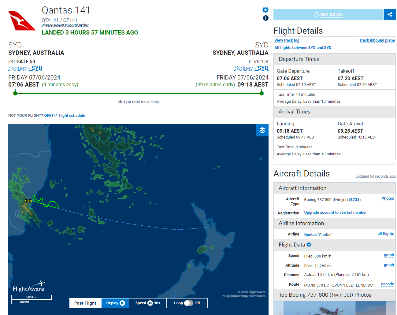 6月7日早上,一架飞往奥克兰的澳航飞机在飞行途中与一只鸟相撞,不得不折返悉尼。QF141航班在早上7点左右起飞,在飞往新西兰约30分钟后,不得不调转航向返回悉尼,并于上午9点左右安全着陆,没有乘客或机组人员受伤,飞机是否受损尚不清楚。航班追踪数据显示,这架波音737客机飞越塔斯曼海,然后掉头返回。澳洲航空公司发言人表示,将尽快为乘客重新安排座位,对造成的不便表示歉意。