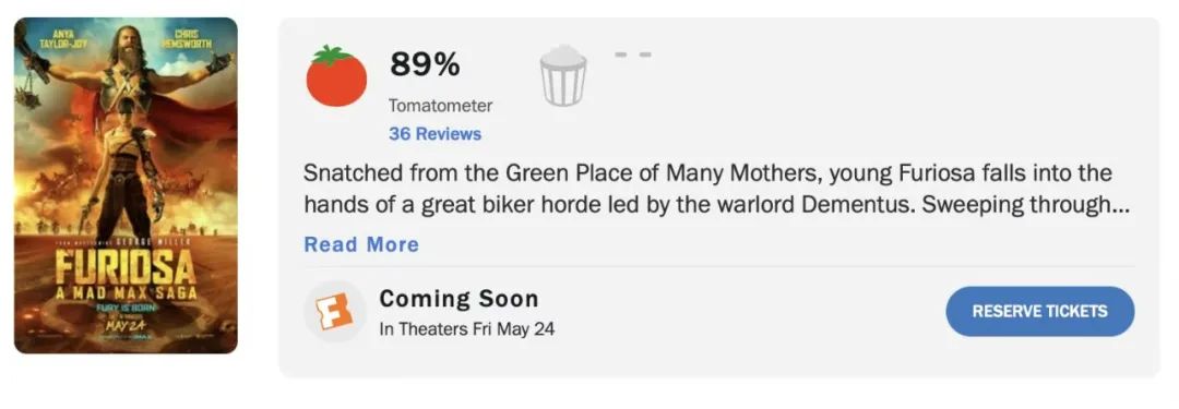 从口碑来看,《麦克斯5》的烂番茄新鲜度达到90%,影评人表示其以“更大的情感分量”丰富了《狂暴之路》,对系列“主脑”乔治·米勒也多加赞扬,尽管在势能上与前作尚不完全匹配;同时《麦克斯5》的爆米花指数也冲高至90%,可见观众对这部续集的质量亦予以肯定。作为对比,《加菲猫》在烂番茄上的两项指标仅为38%和81%。在映后环节,《麦克斯5》的CinemaScore评分为B+,与《加菲猫》相同。