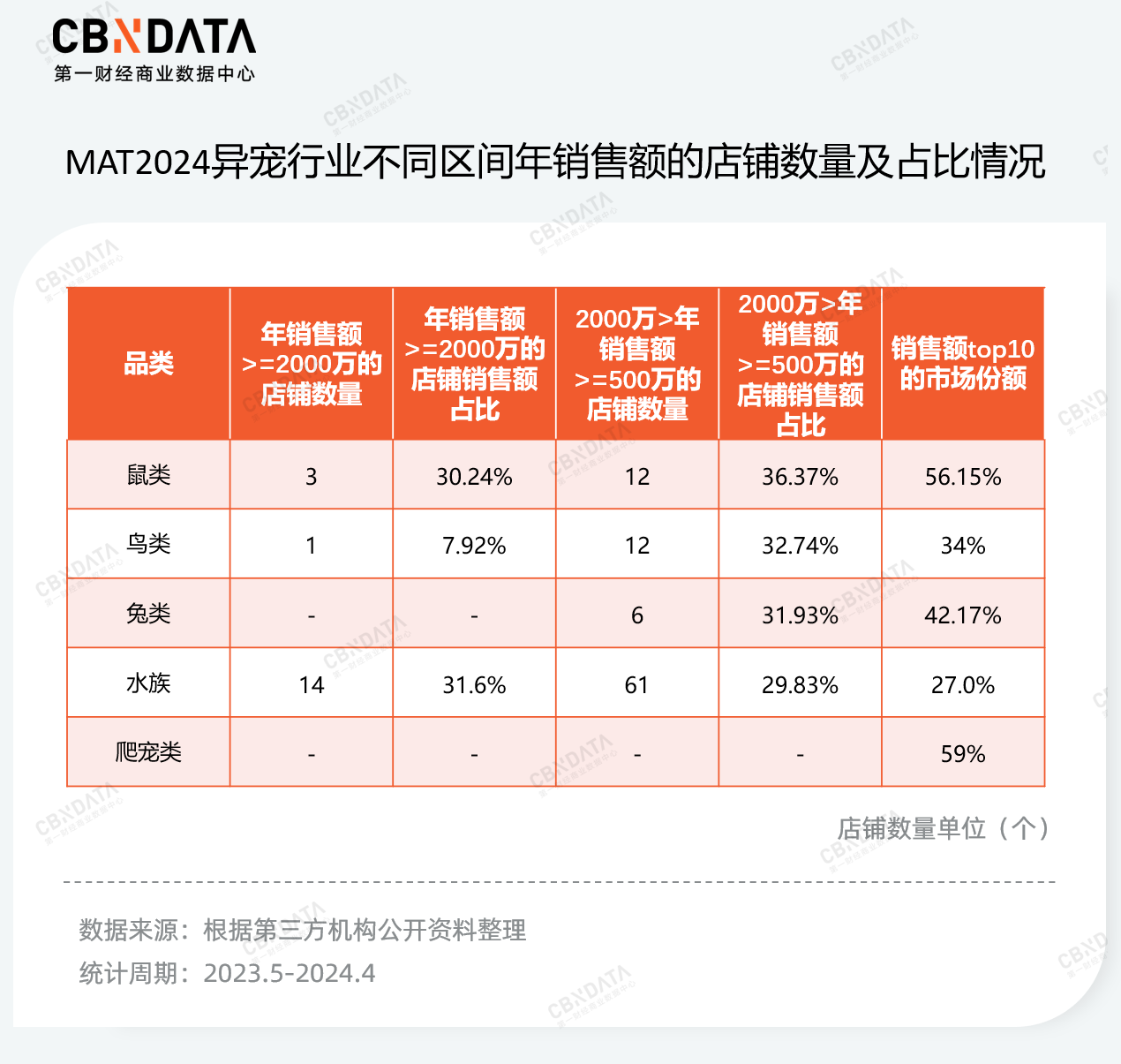如果以500万元为分界线,鼠类、水族年销售额在500-2000万元的店铺销售额总占比为36.37%和29.83%,显示出许多中小品牌正在迅速成长。特别是在鼠类用品市场,年销售额在500-2000万元的店铺市场份额接近37%,这一比例甚至超过了前三大店铺的总和,表明中小品牌正在迅速扩大市场份额,逐步缩小着与头部品牌的差距。