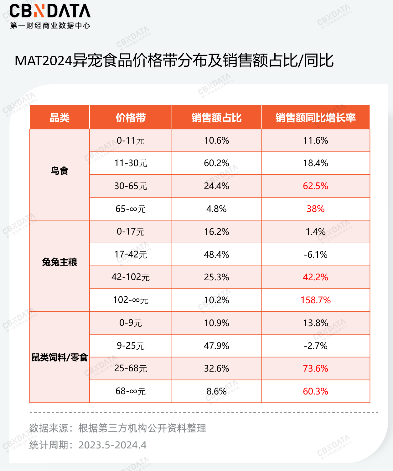 对于鸟食而言,30元以下的价格区间是主流,占比超过70%且增长稳定。而30-65元及65元以上的价格带销售额虽然占比不高,但同比增长较快,这表明鸟食的高端市场同样具有较大的增长潜力。鼠类饲料/零食的走势亦是如此,低端价格带食品销售额呈现下滑趋势,中高端价格带增长销售额增长迅速。
