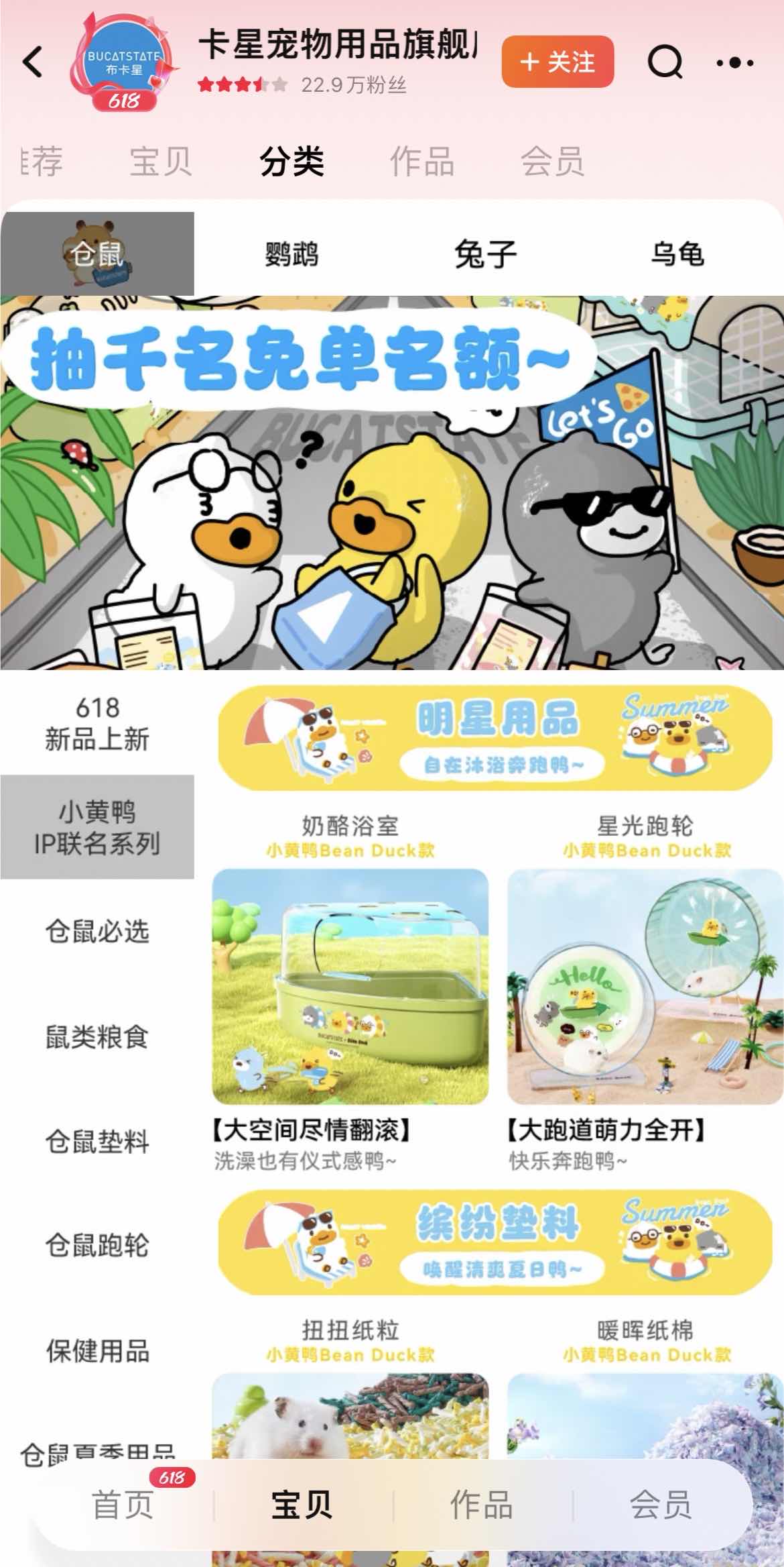 依靠差异化建立了初期的客户基础后,布卡星围绕仓鼠笼进行品类拓宽,逐步覆盖了垫料、跑轮等一系列刚需。同时,品牌对原有造景产品进行了迭代升级,如在空间上进行加大,推出70cm加大仓鼠笼,以及在垫料上升级玩法,从原料、气味、功能、季节、配色等不同维度对垫料进行细分,让消费者可以根据需要自由组合等。今年5月份,布卡星还和小黄鸭Bean Duck联名推出系列主题款小宠用品及外带笼,完成了从产品研发到品牌声量的不断进阶。