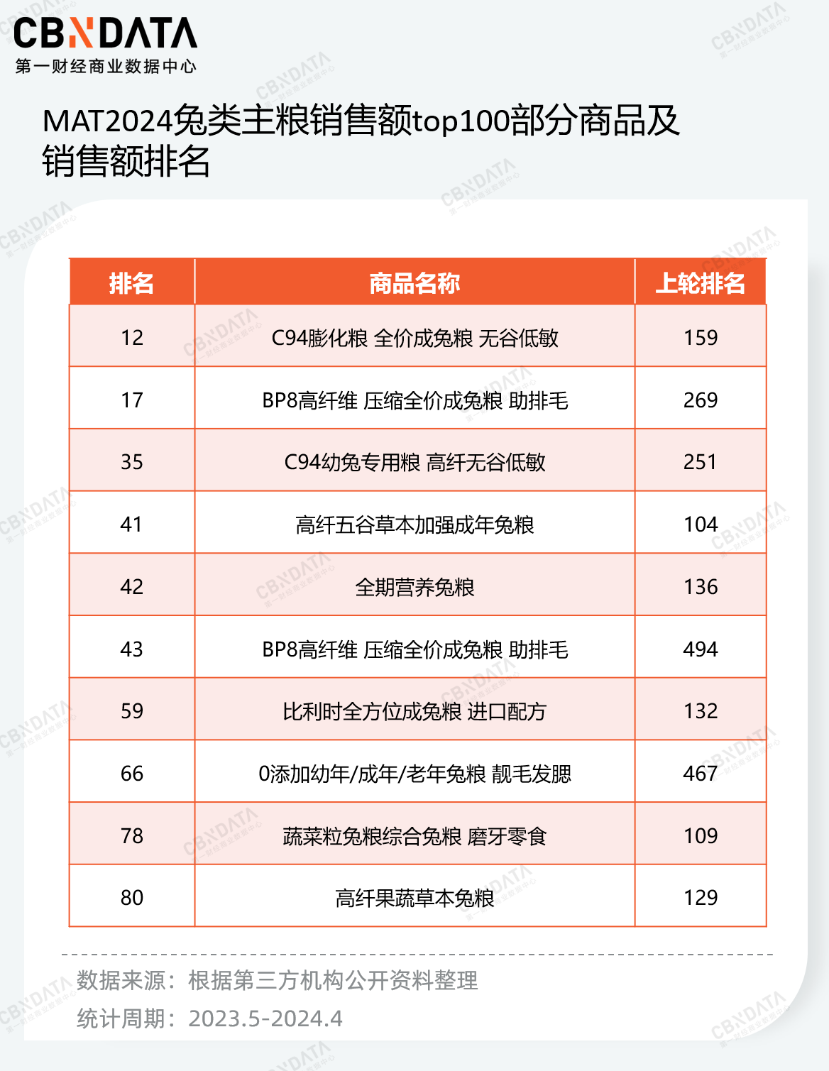 以兔粮为例,我们筛选了近一年销售额在top100但上轮排名不在前100的商品,发现这些跃迁增长的商品中,有超过一半的成交价格都在40元以上。品类不仅覆盖兔兔成长的全周期,也涌现出膨化粮、冻干粮、压缩粮等各种形态。在主粮营养上,绝大多数都添加了益生菌、酵素、植物成分等功能性成分,宠物主尤其关心兔兔的肠胃和毛发健康。其中,兔粮成交单价最高的是来自于比利时的进口兔粮,其产品描述中声称添加了牧草鲜蔬纤维、亚麻籽油、丝兰-yucca提取物等天然成分,在提升品质的基础上还优化了口感。