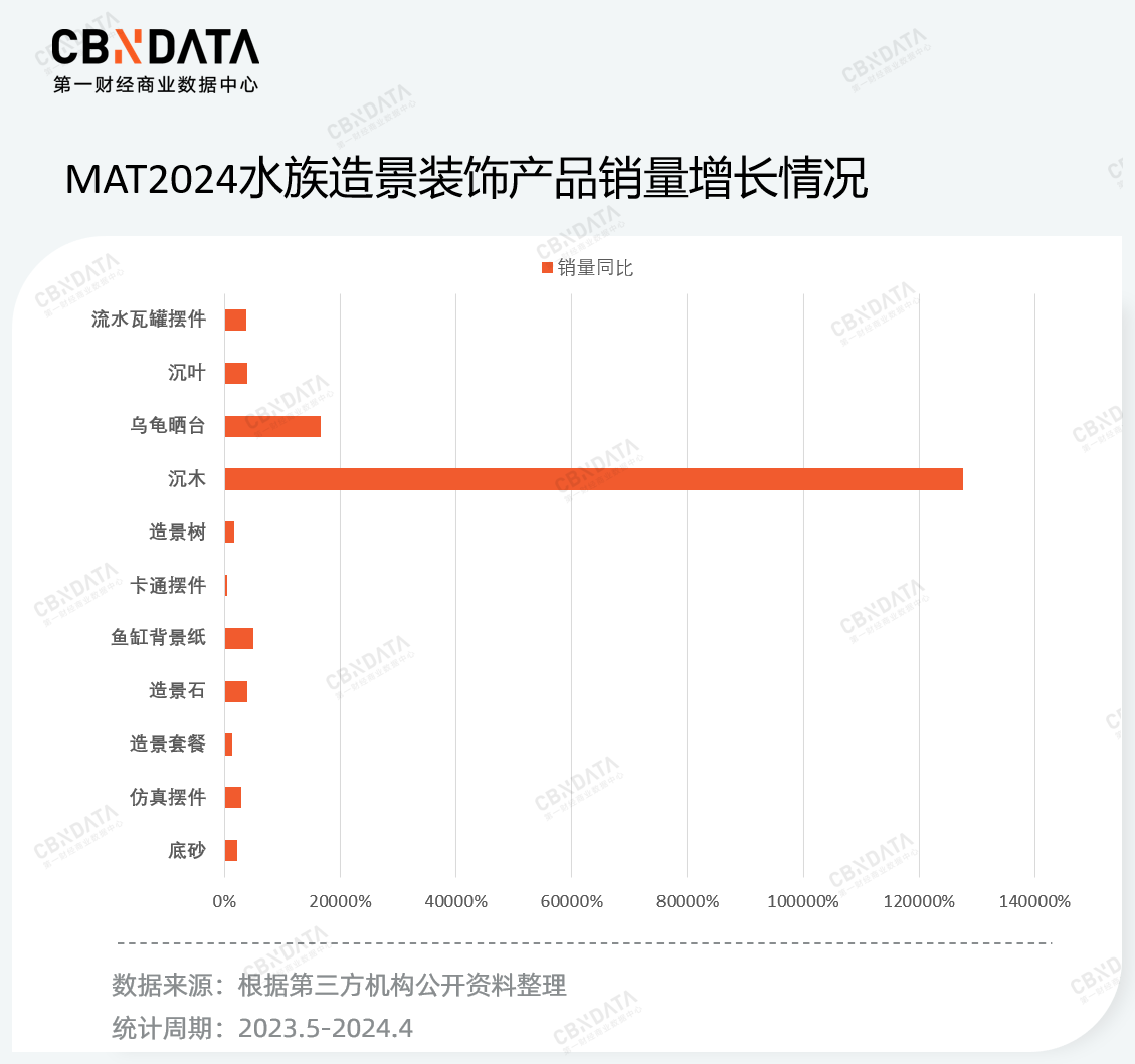 以鱼类为例,根据第三方机构公开资料整理,过去一年水族设备销量top3分别是过滤设备、水草和造景/装饰,其中造景/装饰品类同比增长7.7%,在高占比的情况下仍然保持了正增长,市场对此类商品的需求远未达到饱和。