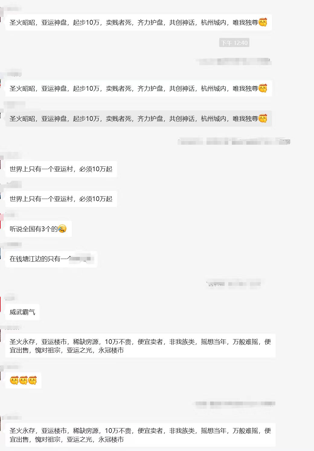 在一个“亚运村大户型联盟,心怀荣耀业主”的微信群里,为了护盘,群里的业主称“圣火永存,亚运楼市,稀缺房源,10万不贵,便宜卖者非我族类,遥想当年,万般难摇,便宜出售愧对祖宗,亚运之光,永冠楼市”。