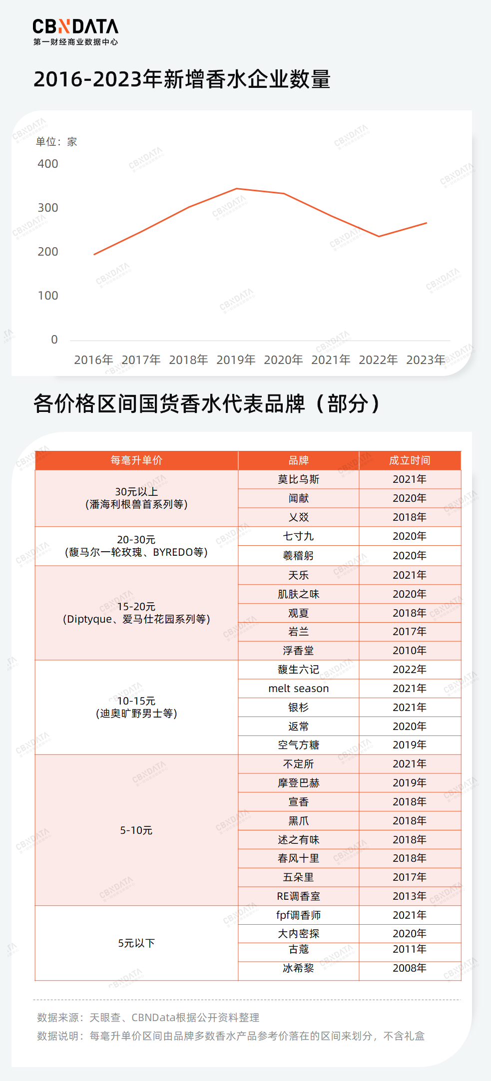 与此同时,国产香水也在开枝散叶,与海外香水形成正面竞争。根据CBNData不完全统计,我国香水行业在2018年到2021年的四年间,每年都有近300家新的本土香水企业加入市场竞争,在2022年后仍保持着200家以上的增长规模。尤其近年来欣欣向荣的国产香水新贵们大多成立于在这波热潮。