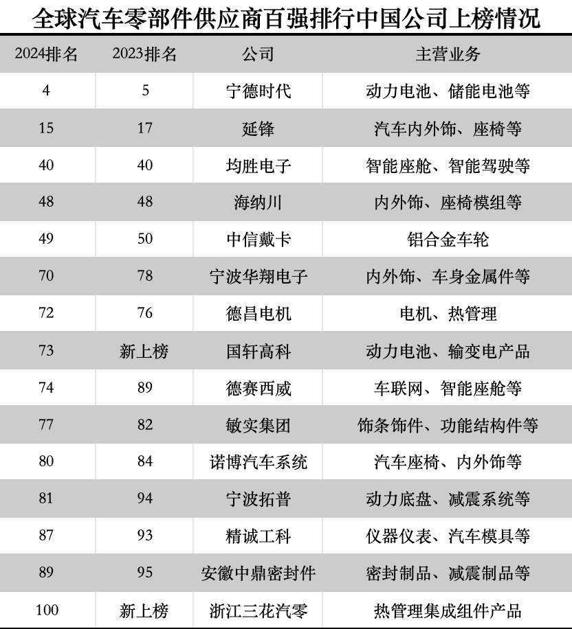 《美国汽车新闻》近日发布的2024年全球汽车零部件供应商百强榜单显示,中国汽车公司上榜总数较往年进一步增加,整体排名也有所提升。