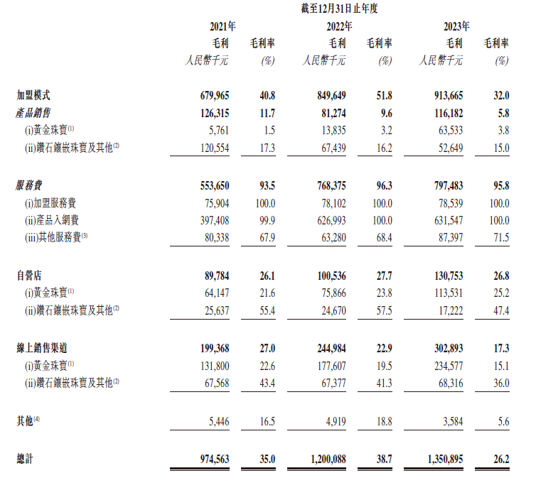 之前周六福招股书曾提到,每新增一家加盟店,便能一次性收取18.5万-35万元的服务费,以及后续11万-25万元的续约费。本次招股书又提及,在加盟模式下,平均每家加盟店的收入贡献由2021年的46万增加至2023年的69万,平均每家加盟店的毛利贡献由2021年的19万增加至2023年的22万。