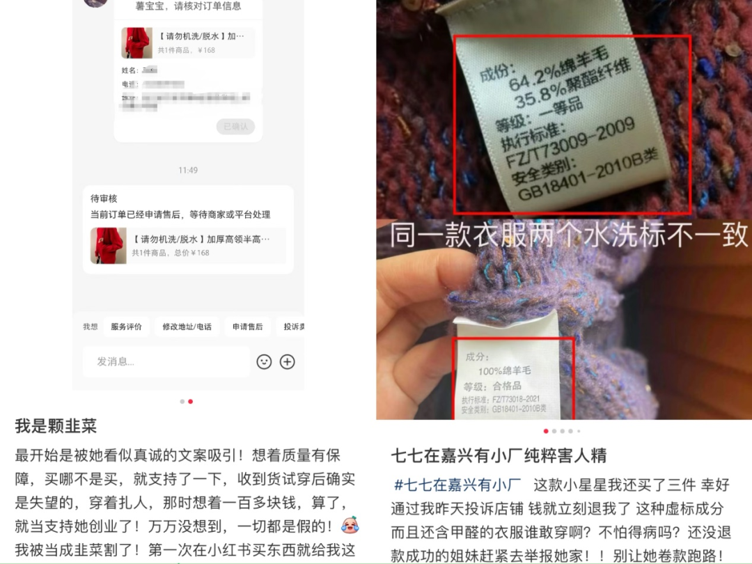 “之前因为她说自己的是羊毛衫厂二代,我们看她文案很真诚都到她家买,后面被扒出来她并不是工厂一手货源而是到别人那里拿货。”姚熙曾因为该“厂二代”账号粉丝多且店铺销量高,多次购买该家衣服,还曾“专门定闹钟看直播蹲点抢”,却最终发现自己好像“当了韭菜”。