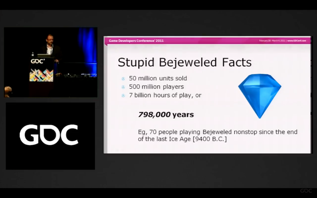 玩家在《宝石迷阵》上花费的时间总和为79.8万年——相当于70个人不停地玩,从上一个冰河时代(公元前9400年)玩到2011年所花的总时长。