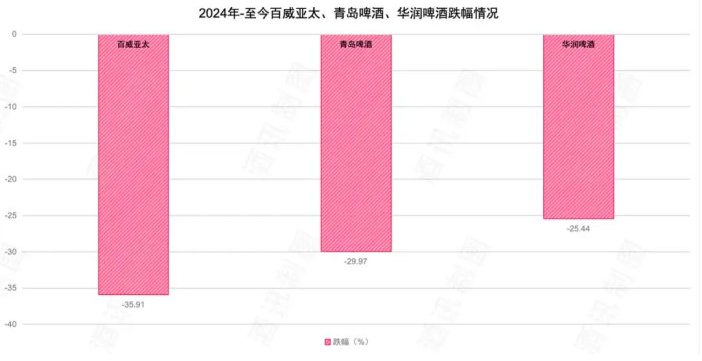 酒讯智库统计了解到,2024年以来,A股啤酒股们几乎全线下跌,跌幅在4.29%—41.63%之间,港股百威亚太、青岛啤酒、华润啤酒的跌幅均超过20%,分别下跌35.91%、29.97%、25.44%。