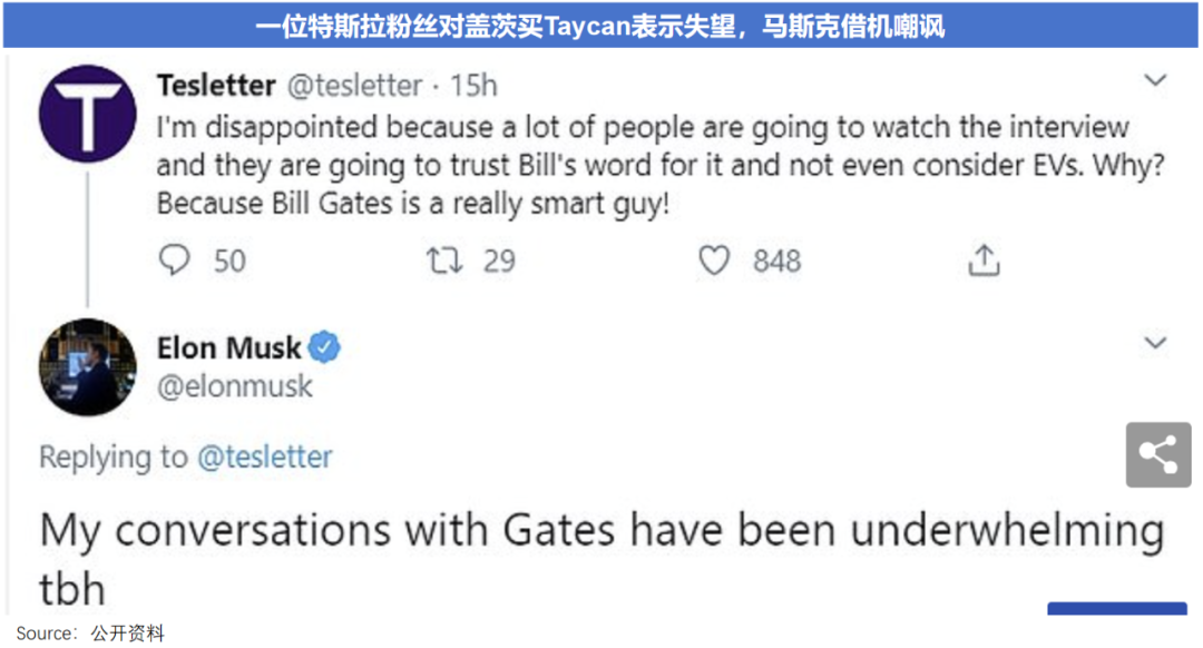 2020年,马斯克在推特上向比尔·盖茨开炮,因为盖茨在采访里夸了特斯拉,最后却买了保时捷Taycan。