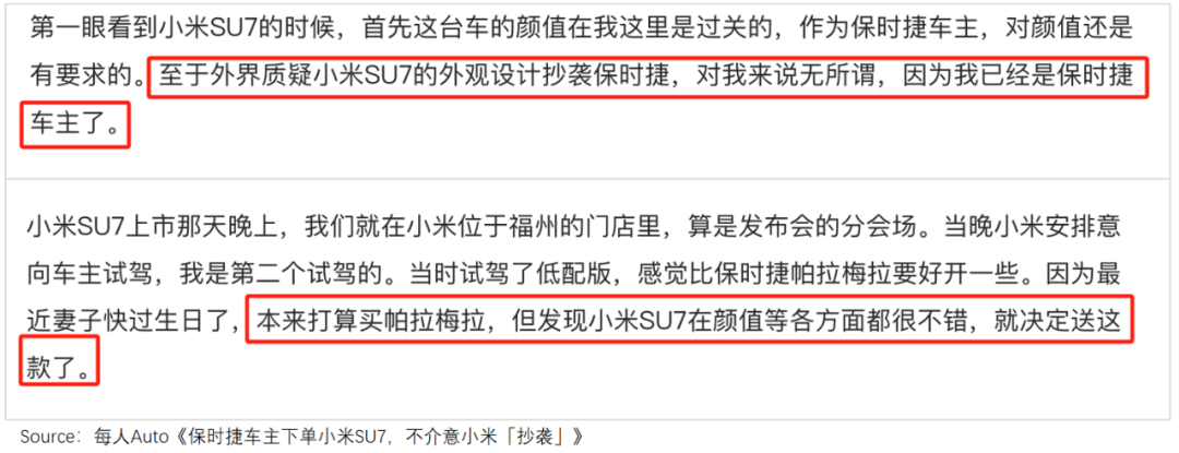 当下的小米Su7,也不一定能抢走保时捷的消费者,但显然会给保时捷的品牌势能带来压力。