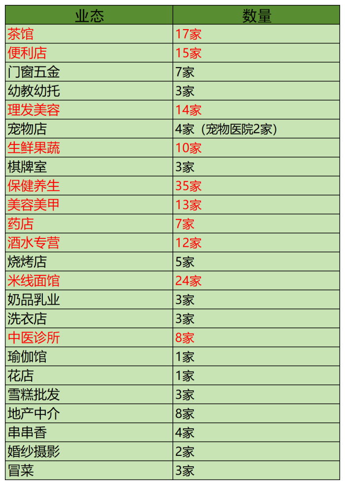 成都双流这个中等规模的社区,长约520米,宽约210米,坐落着17家茶馆,15家便利店,35家保健养生等等,酒水专营一类的有12家,米线面馆一类的24家,纯粹的药店还有7家。
