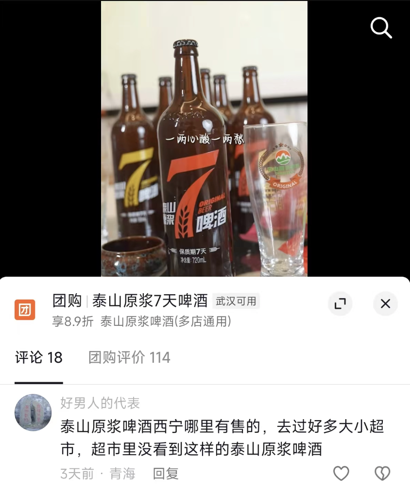 在社交媒体上,部分用户提到近年泰山啤酒味道相较之前变得寡淡,口感不如从前。在黑猫投诉平台上,关于泰山原浆售卖临期/过期产品、发货不及时等问题的投诉多达70余起。