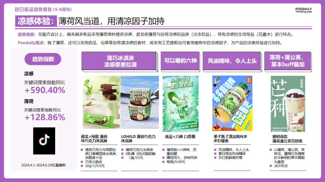 不少食饮品牌也抓住了薄荷的流量密码。除了玛氏,在Foodaily每日新品趋势报告观察中,我们关注到近两月,LOHILO也推出了薄巧冰淇淋,炫迈在口香糖中添加薄荷脑,推出劲爽六神味风味,果子熟了推出了一款薄荷清凉风味柠檬茶,现制茶饮赛道里,薄荷也成为了流行元素...