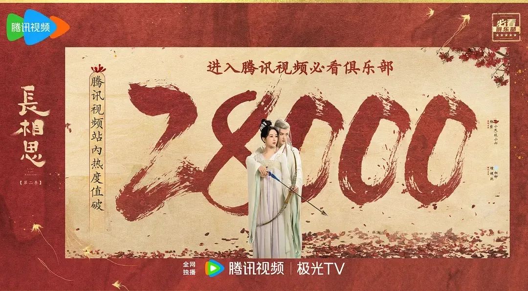 在7月8日,《长相思2》首播之后,便引发不俗的热度。不仅腾讯视频站内热度突破28000,进入腾讯视频必看俱乐部,同时,也打破了腾讯视频2024年弹幕互动量最快破1000万纪录。