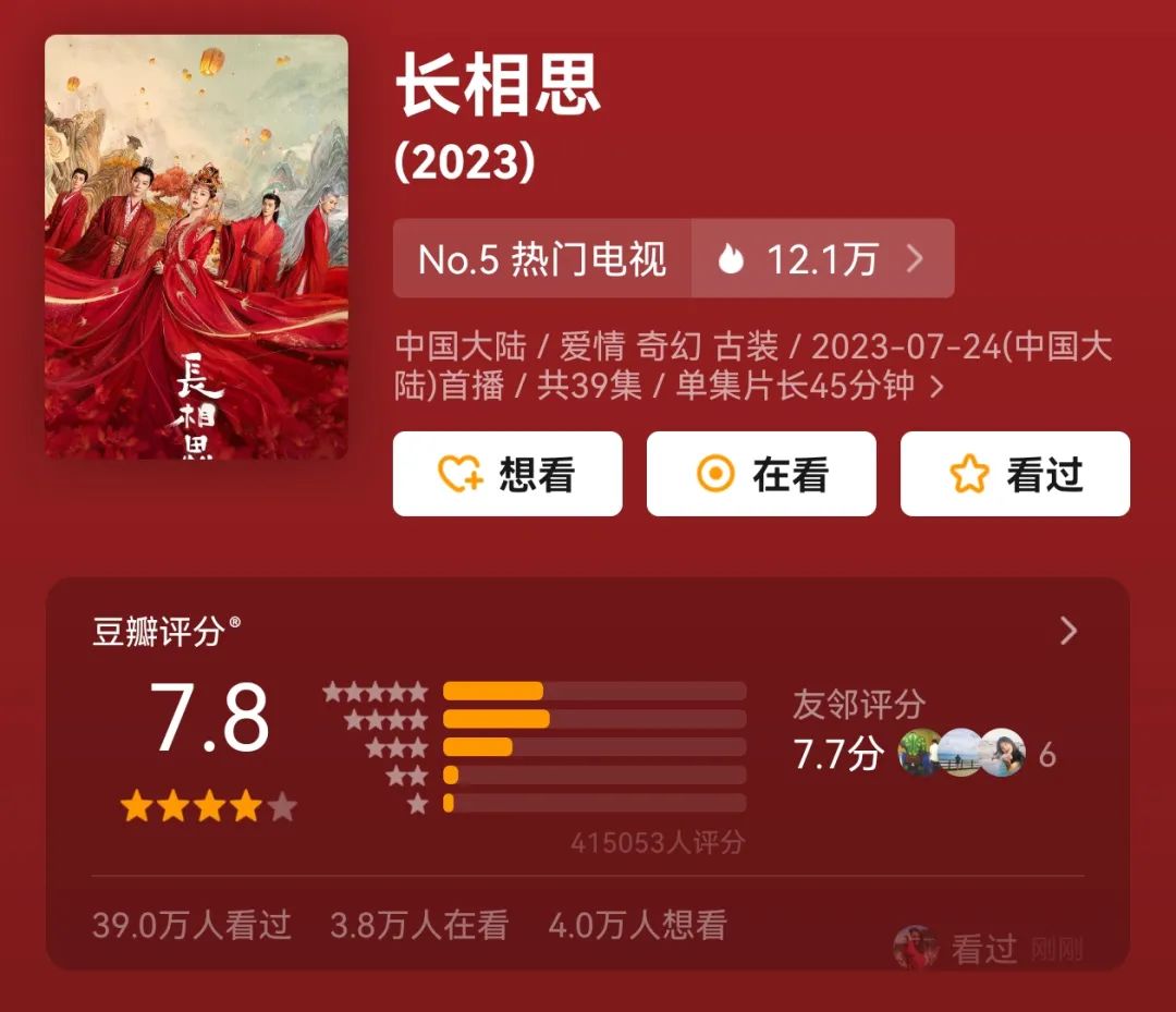 根据云合平台的数据显示,《长相思》第一季的云合评级达到S+,正片有效播放最高市占率为34.8%。不仅剧集的播放量突破亿次,另外,评分更是一度高达8.1分,当前7.8分,仍旧是近年来难得的高分古装剧。