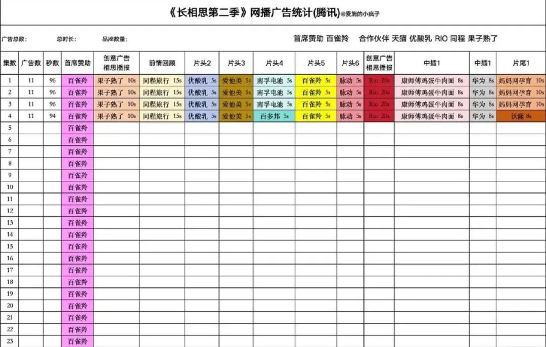 在目前播出的剧集中,合作品牌已经有多家,每集集均12个广告,包含了首席赞助、合作伙伴等,分布于前情回顾、片头广告、中插广告、创意广告、片尾广告等。