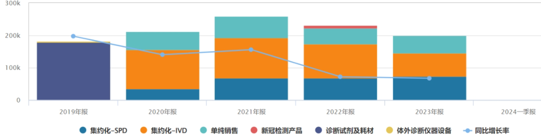 2023年,塞力医疗实现营收20.06亿元,同比下降13.1%;归母净利润亏损1.59亿元。其中IVD和SPD(医用耗材集约化运营服务)业务营收占比分别为35.86%、36.93%。塞力医疗在财报中解释,部分IVD业务到期后未做续约安排。同时,由于集采等政策原因,部分客户收入额出现一定幅度下降。