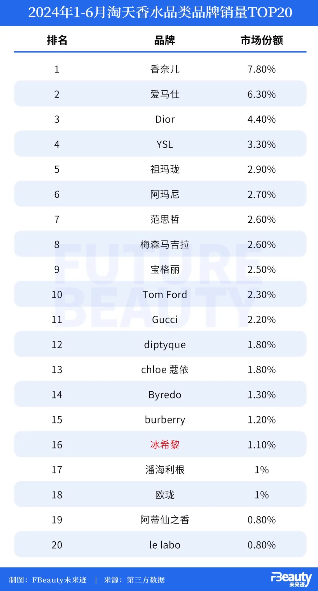 一份第三方数据显示,在2024年上半年的淘宝、天猫平台香水品类的品牌销量榜单中,TOP20的位置几乎被外资大牌香水全部包揽,香奈儿、爱马仕、Dior三个品牌就占据了18.5%的市场份额。而唯一上榜的国货香水品牌仅有冰希黎这一个品牌,排名第16位。