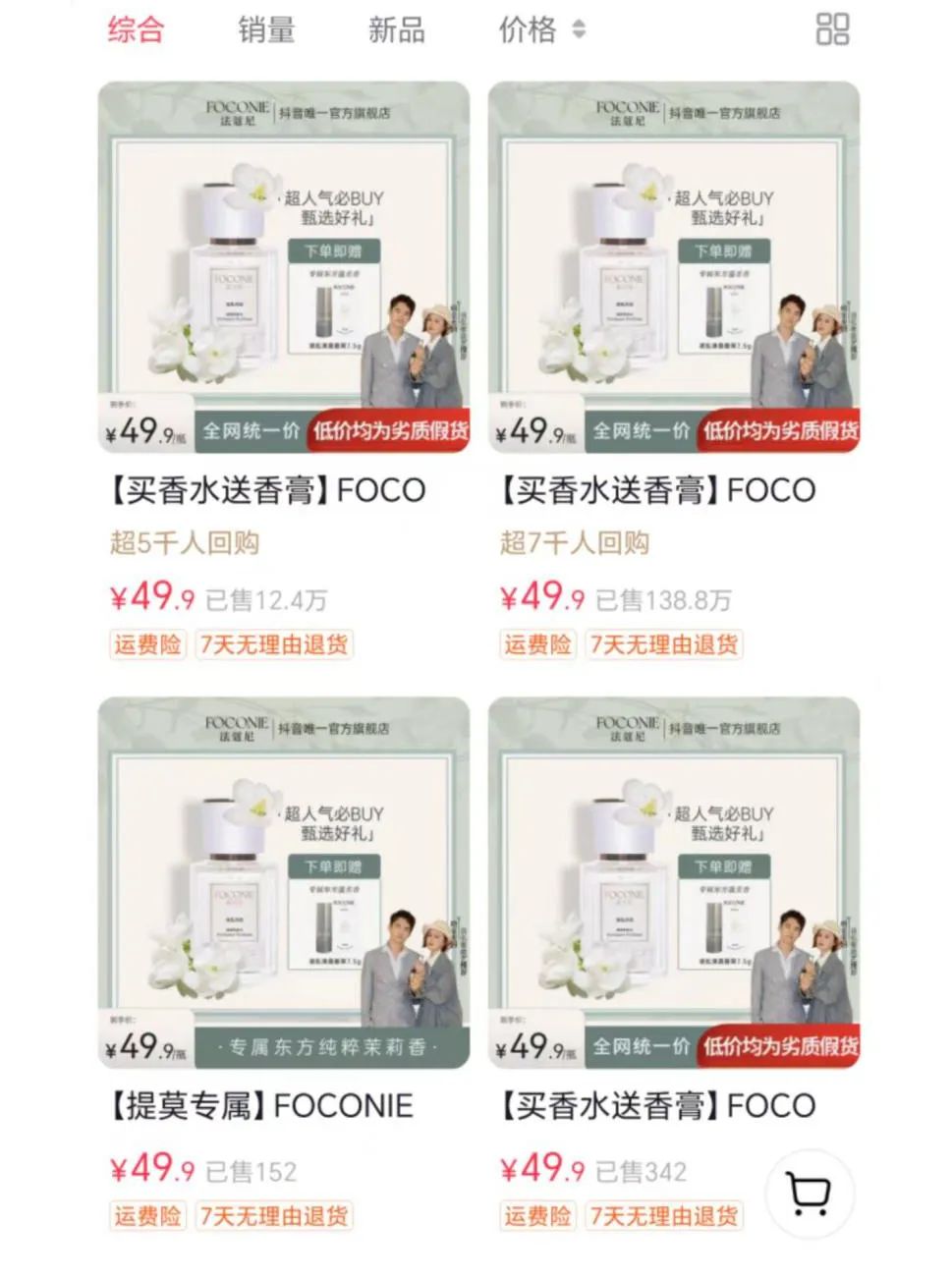 例如,草本海洋标价为49.9元的固体香膏已售超过250万件,fpf肌肤之欲香水销量已超120万件,古蔻一款39.9元的无人区玫瑰香水销量已达93万件。foconie法蔻尼凭借一款SKU、两种香型,其官方旗舰店就已卖出超150万件,并成为2024年上半年抖音平台香水销量的第九名。