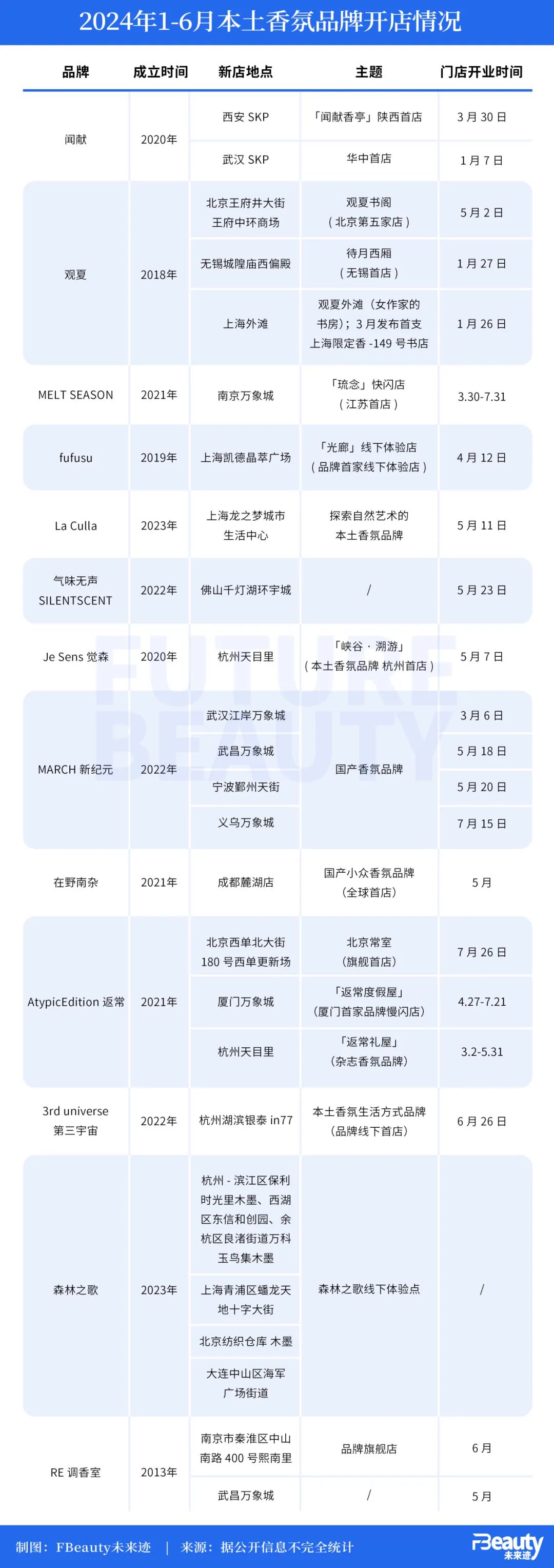 今年上半年,有至少11个本土香水香氛品牌开出了18家线下店铺。其中既包括「闻献Documents」、「观夏to summer」等头部香水品牌,还有「La Culla」、「MARCH新纪元」、「3rd universe第三宇宙」等成立不久的新锐品牌。
