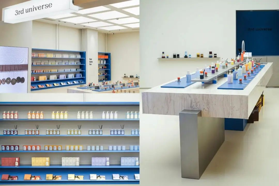 此外,追求日常轻趣味的本土香氛品牌「3rd universe第三宇宙」、此前只在买手店出现的小众香氛品牌「在野南杂」都在今年开出品牌的线下首店。其中,「3rd universe第三宇宙」以“蓝色岛台+多巴胺配色的产品”为消费者带来一个沉浸式香气空间。