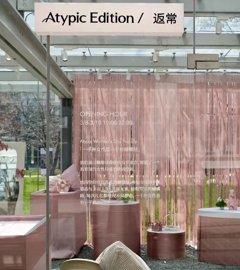 定位于杂志香氛品牌的「AtypicEdition返常」,在今年3月开启了品牌首家线下慢闪店——位于杭州天目里的「返常礼屋」,「返常礼屋」以巨大的蝴蝶结装置作为主设计元素,以烘托“礼物”的氛围,并在陈列区依次域展示了品牌三个系列产品。而后的4月,品牌又在厦门开启「返常度假屋」,用雏菊元素、南洋藤编工艺等打造了一个独具厦门城市底色的田园风情街区。
