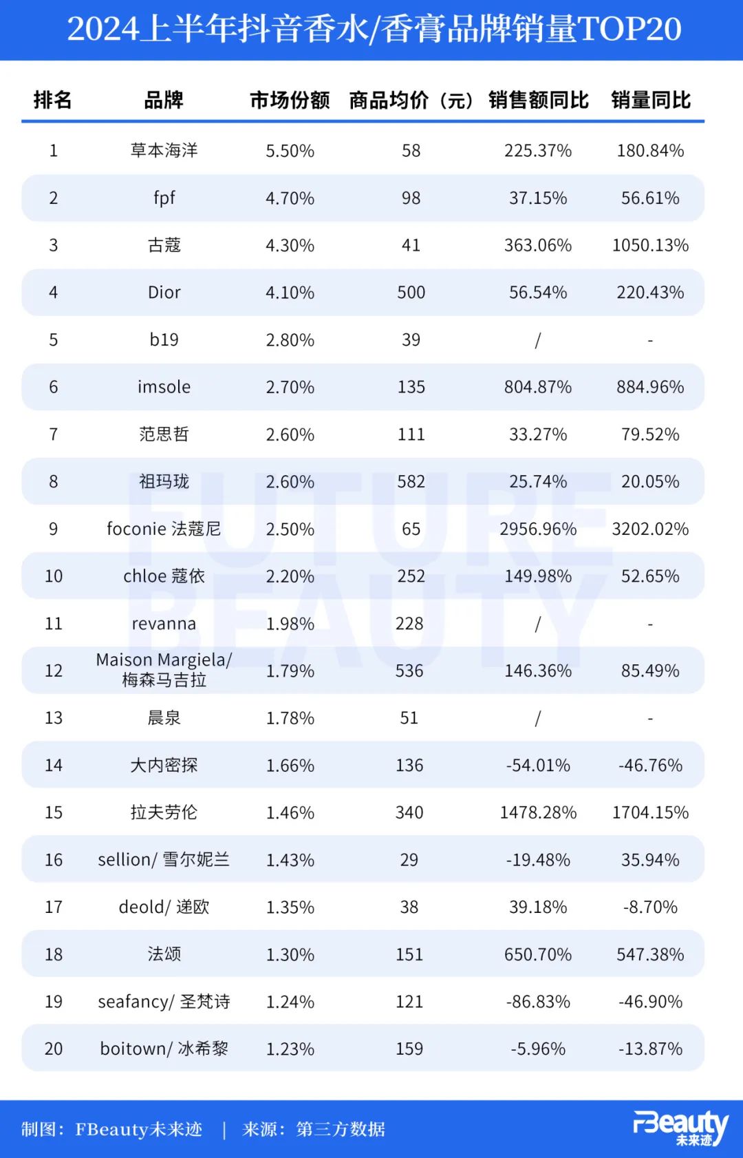 数据显示,今年上半年抖音平台香水/香膏品类的销量TOP3全被国货品牌包揽,其中草本海洋、古蔻两个品牌的销售额同比和销量同比均超过了100%。而从全榜单来看,大多数国货香水品牌的销售额和销量同比激增,foconie法蔻尼甚至实现超四位数的同比增长。