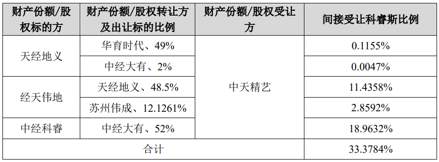 中天精装7月23日公告,公司全资子公司深圳中天精艺投资有限公司(简称“中天精艺”)拟以现金方式受让深圳市华育时代科技有限公司持有的深圳天经地义企业管理有限公司(简称“天经地义”)49%股权、深圳中经大有私募股权投资基金管理有限公司(简称“深圳中经大有”)持有的天经地义2%股权,并受让天经地义、苏州伟成技术服务有限公司分别持有的深圳经天伟地企业管理合伙企业(有限合伙)(简称“经天伟地”)48.5%、12.1261%财产份额;同时,中天精艺拟受让深圳中经大有持有的东阳市中经科睿股权投资合伙企业(有限合伙)(简称“中经科睿”)52%财产份额。