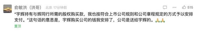 俞敏洪在《致东方甄选股东朋友的一封公开信》中表示,从今天开始,东方甄选的全资子公司与辉同行,将正式从东方甄选独立出去,由董宇辉个人持有其100%股权。同时,“宇辉买公司的钱我(指由东方甄选)安排了,公司是送给宇辉的。”