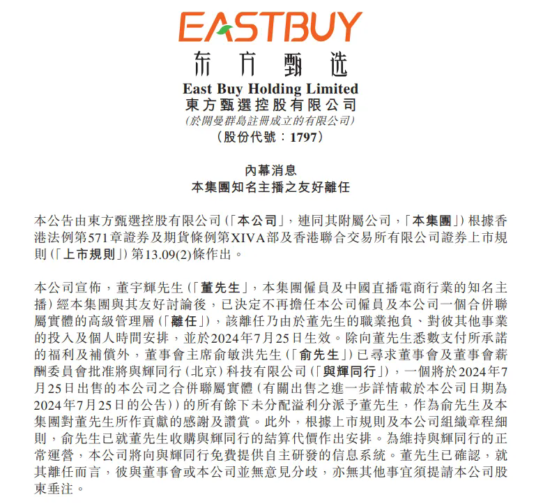 7月25日,东方甄选在港交所发布公告,董宇辉已决定不再担任公司雇员及公司一个合并联属实体的高级管理层,该离任乃由于董宇辉的职业抱负、对彼其他事业的投入及个人时间安排,并于2024年7月25日生效。