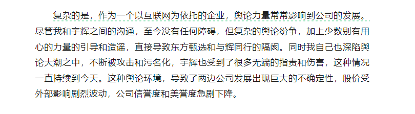 实际上,俞敏洪自己似乎也意识到了公司管理中的问题,他说,“舆论力量常常影响到公司的发展。尽管我和宇辉之间的沟通,至今没有任何障碍,但复杂的舆论纷争,加上少数别有用心的力量的引导和造谣,直接导致东方甄选和与辉同行的隔阂。”甚至表示,自己作为老板都“不敢”出现在董宇辉的直播间。