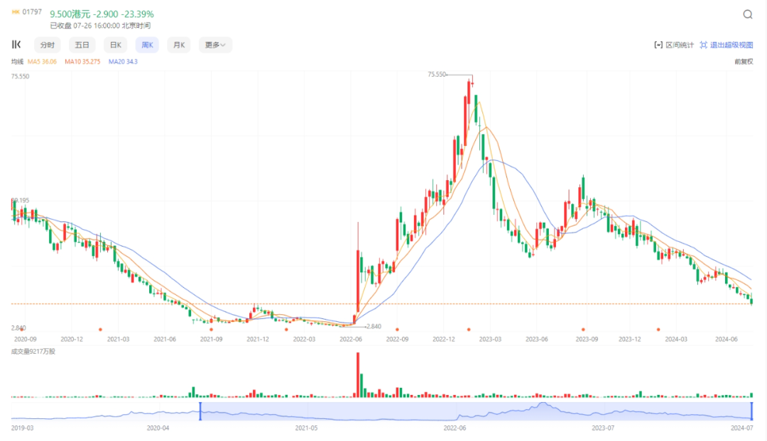 二级市场上,东方甄选的股价从2022年6月开始暴涨,一路从3.7港元/股暴涨到最高的75.7港元/股,市值直接翻了20多倍;到了2023年,东方甄选股价开始回弹,一直到去年底“小作文事件”之后,股价开始呈现强下滑趋势。