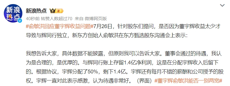 当提到董宇辉的离开是不是因为待遇不够的时候,俞敏洪解释道,到现在“与辉同行”账上还趴着1.4亿元的利润,这个利润是在董宇辉已经拿走了全部利润50%之后的结果,换句话说董宇辉个人已经拿走了1.4亿元的奖励;此外,这原本应该100%属于东方甄选的1.4亿元利润被赠予与辉同行,其主要的原因除了表达对董宇辉以及对社会的善意之外,还有就是董宇辉原本也有股权激励,但是由于他不再任职这部分股权激励也将终止,所以相当于这部分钱折现了。