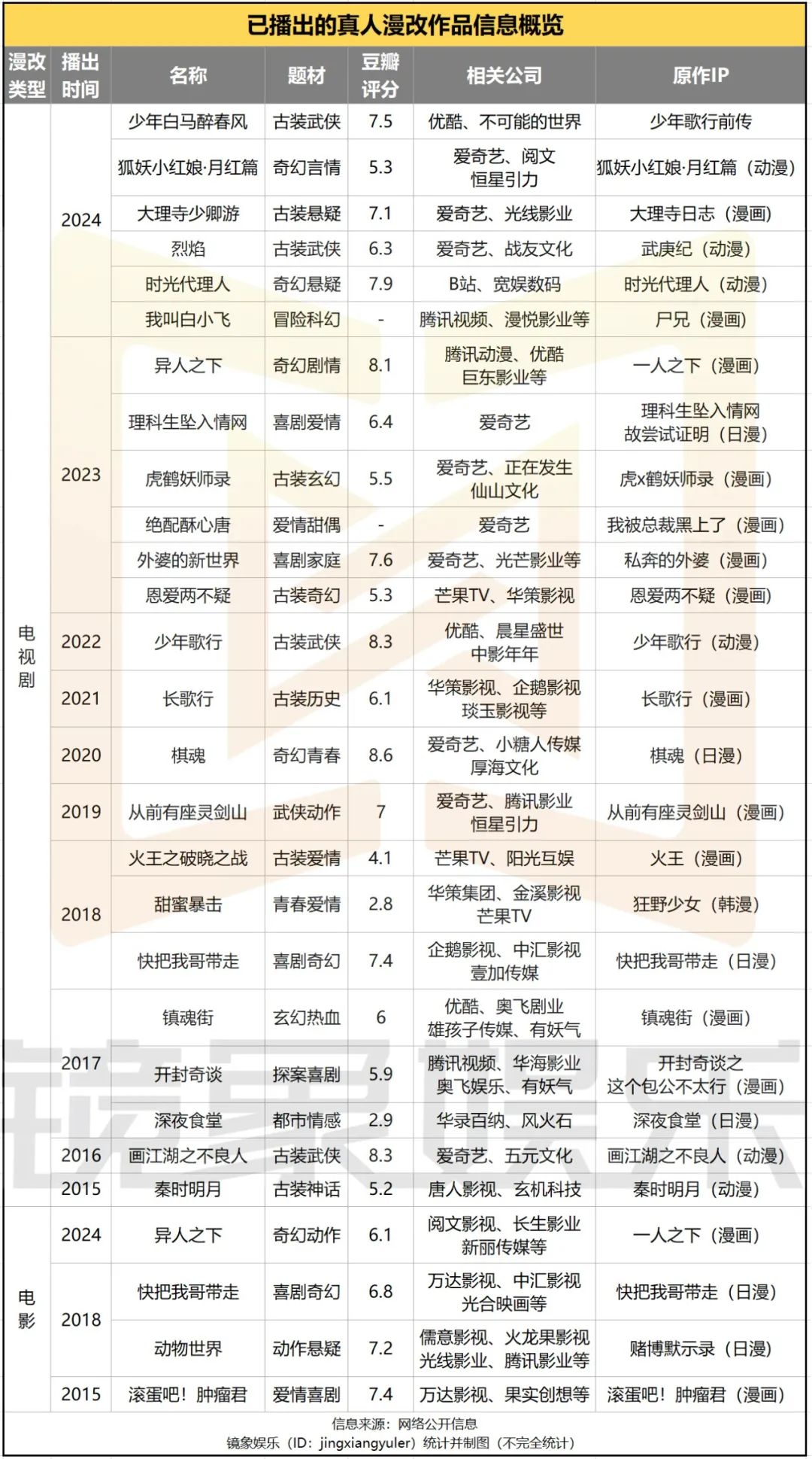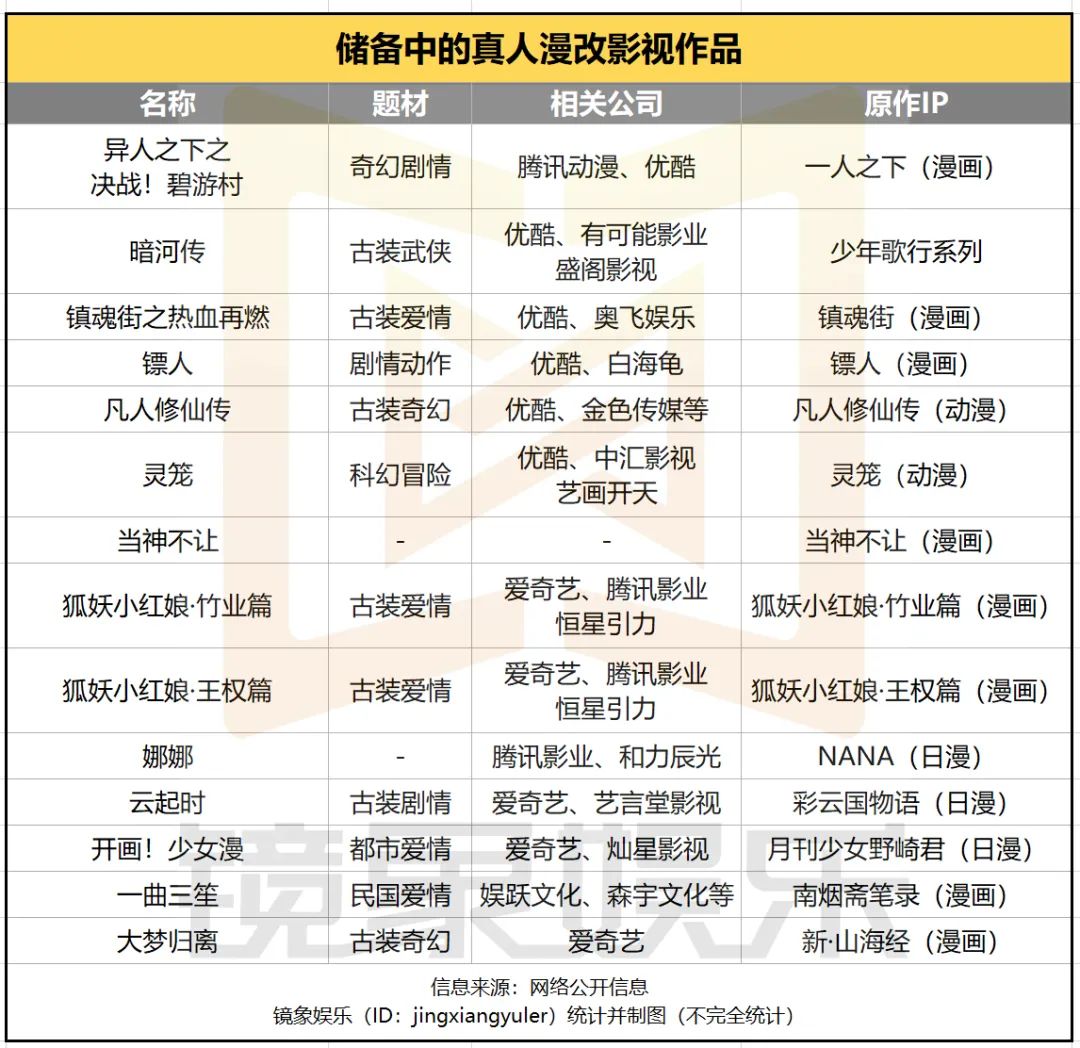不好的一面在于,围绕真人漫改的探索是一个长期的过程,国内大多创作团队还处在积累经验的阶段,爆发期尚未到来。同时,大多真人漫改走的都是系列化开发的路线,比如《异人之下》《镖人》等影视共同开发,《少年歌行》除了前传《少年白马醉春风》,同系列的外传《暗河传》也在开发中,《狐妖小红娘》从一开始就官宣三部漫改同步进行。