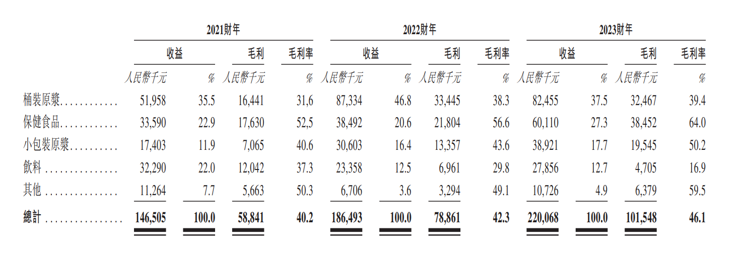 分产品来看,该公司的主要收益来自桶装原浆、保健食品、小包装原浆、饮料和其他这五大类。其中,桶装原浆是宇航人的最大收入来源。报告期内,桶装原浆收入分别为0.52亿元、0.87亿元和0.82亿元,占比分别为35.5%、46.8%和37.5%。